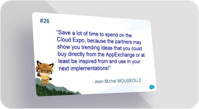 #26 “Save a lot of time to spend on the Cloud Expo, because the partners may show you trending ideas that you could buy directly from the AppExchange or at least be inspired from and use in your next implementations!” - John Lay - Jean-Michel MOUGEOLLE