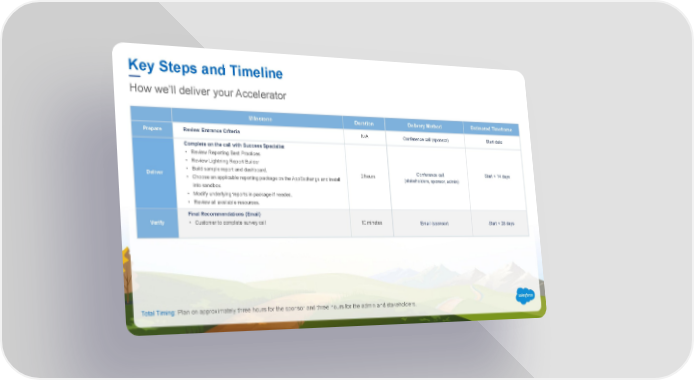 Key Steps and Timeline How we’ll deliver your Accelerator Milestone Duration Delivery Method Estimated Timeframe Prepare Review Entrance Criteria N/A Start date Conference call (sponsor) Complete on the call with Success Specialist • Review Reporting Best Practices • Review Lightning Report Builder • Build sample report and dashboard. Conference call Start + 14 days Deliver 2 hours • Choose an applicable reporting package on the AppExchange and install (stakeholders, sponsor, admin) into sandbox. • Modify underlying reports in package if needed. • Review all available resources. Final Recommendations (Email) Verify • Customer to complete survey call 10 minutes Email (sponsor) Start + 28 days Total Timing: Plan on approximately three hours for the sponsor and three hours for the admin and stakeholders.