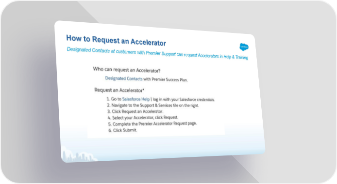 Accelerate to Success with Salesforce Accelerators Page 10 Page 12How to Request an Accelerator Designated Contacts at customers with Premier Support can request Accelerators in Help & Training
