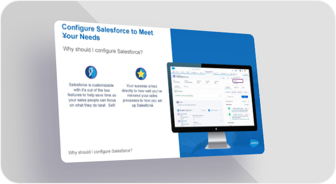Configure Salesforce to Meet Your Needs Why should I configure Salesforce? Salesforce is customizable Your success is tied with it’s out of the box directly to how well you’ve features to help save time so mirrored your sales your sales people can focus processes to how you set on what they do best: Sell! up Salesforce. Why should I configure Salesforce?