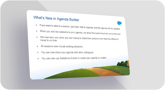 What’s New in Agenda Builder ● If you want to attend a session, just click ‘Add to Agenda’ and My Agenda will be updated ● When you add two sessions to your agenda, we show the travel time from one to the next ● We now warn you when you are hoping to attend two sessions that might be difficult to travel to on time ● All sessions now include walking directions ● You can now share your agenda with other colleagues ● You can now use Salesforce Events to create your agenda on mobile