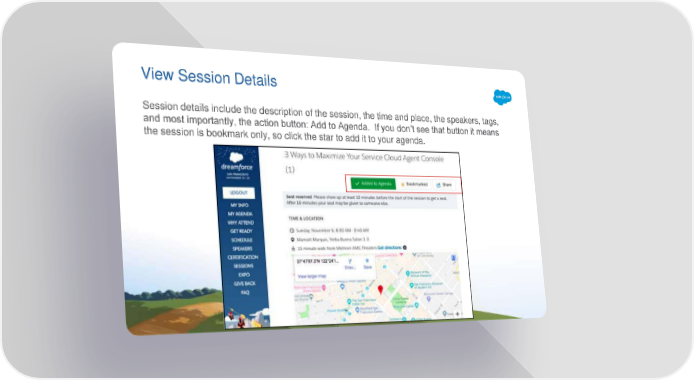 View Session Details Session details include the description of the session, the time and place, the speakers, tags, and most importantly, the action button: Add to Agenda. If you don’t see that button it means the session is bookmark only, so click the star to add it to your agenda.