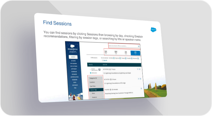 Agenda Builder Overview Page 5 Page 7Find Sessions You can find sessions by clicking Sessions then browsing by day, checking Einstein recommendations, filtering by session tags, or searching by title or speaker name.
