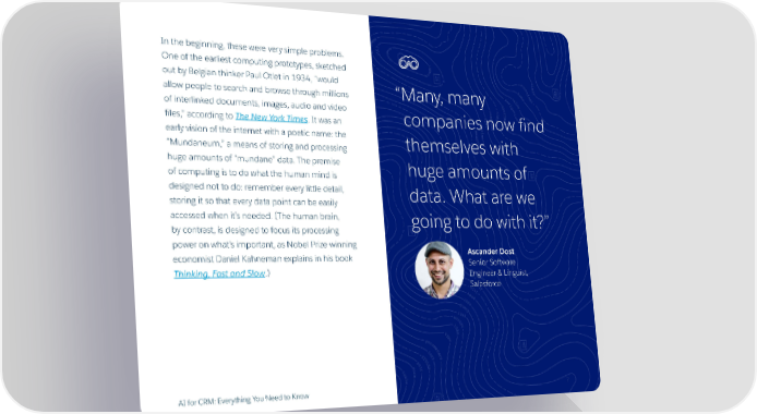 In the beginning, these were very simple problems. One of the earliest computing prototypes, sketched out by Belgian thinker Paul Otlet in 1934, “would allow people to search and browse through millions “Many, many of interlinked documents, images, audio and video companies now find files,” according to The New York Times. It was an early vision of the internet with a poetic name: the themselves with “Mundaneum,” a means of storing and processing huge amounts of “mundane” data. The premise huge amounts of of computing is to do what the human mind is designed not to do: remember every little detail, data. What are we storing it so that every data point can be easily accessed when it’s needed. (The human brain, going to do with it?” by contrast, is designed to focus its processing power on what’s important, as Nobel Prize-winning Ascander Dost economist Daniel Kahneman explains in his book Senior Software Thinking, Fast and Slow.) Engineer & Linguist, Salesforce AI for CRM: Everything You Need to Know 7