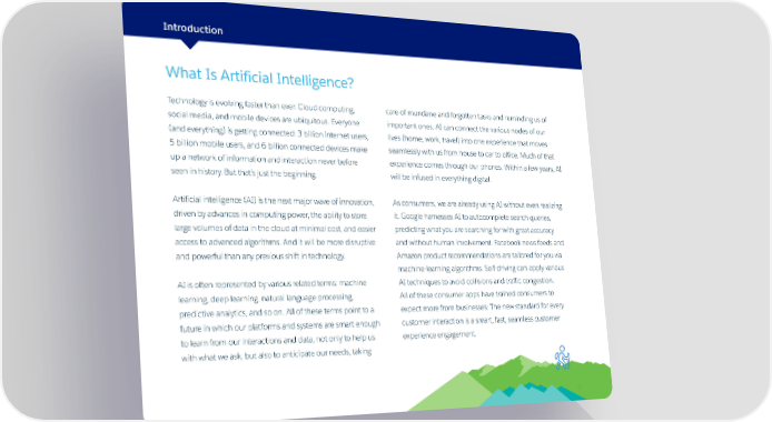 Introduction What Is Artificial Intelligence? Technology is evolving faster than ever. Cloud computing, care of mundane and forgotten tasks and reminding us of social media, and mobile devices are ubiquitous. Everyone important ones. AI can connect the various nodes of our (and everything) is getting connected: 3 billion internet users, lives (home, work, travel) into one experience that moves 5 billion mobile users, and 6 billion connected devices make seamlessly with us from house to car to office. Much of that up a network of information and interaction never before experience comes through our phones. Within a few years, AI seen in history. But that’s just the beginning. will be infused in everything digital. Artificial intelligence (AI) is the next major wave of innovation, As consumers, we are already using AI without even realizing driven by advances in computing power, the ability to store it. Google harnesses AI to autocomplete search queries, large volumes of data in the cloud at minimal cost, and easier predicting what you are searching for with great accuracy access to advanced algorithms. And it will be more disruptive and without human involvement. Facebook news feeds and and powerful than any previous shift in technology. Amazon product recommendations are tailored for you via machine-learning algorithms. Self-driving cars apply various AI is often represented by various related terms: machine AI techniques to avoid collisions and traffic congestion. learning, deep learning, natural language processing, All of these consumer apps have trained consumers to predictive analytics, and so on. All of these terms point to a expect more from businesses: The new standard for every future in which our platforms and systems are smart enough customer interaction is a smart, fast, seamless customer to learn from our interactions and data, not only to help us experience engagement. with what we ask, but also to anticipate our needs, taking 2