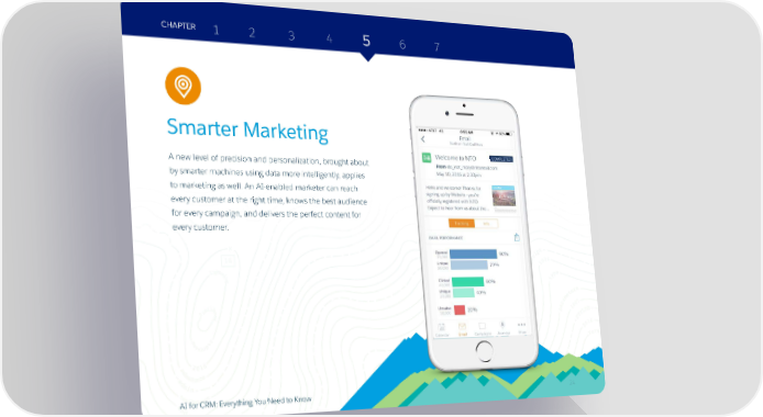 CHAPTER 1 2 3 4 5 6 7 Marketing Smarter Marketing A new level of precision and personalization, brought about by smarter machines using data more intelligently, applies to marketing as well. An AI-enabled marketer can reach every customer at the right time, knows the best audience for every campaign, and delivers the perfect content for every customer. AI for CRM: Everything You Need to Know 2424