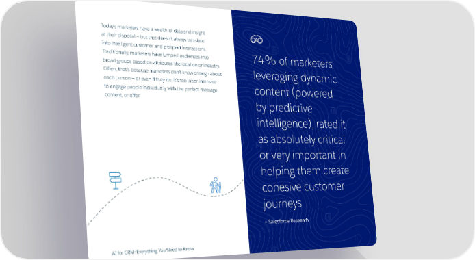 Today’s marketers have a wealth of data and insight at their disposal — but that doesn’t always translate into intelligent customer and prospect interactions. Traditionally, marketers have lumped audiences into 74% of marketers broad groups based on attributes like location or industry. Often, that’s because marketers don’t know enough about leveraging dynamic each person — or even if they do, it’s too labor-intensive to engage people individually with the perfect message, content (powered content, or offer. by predictive intelligence), rated it as absolutely critical or very important in helping them create cohesive customer journeys — Salesforce Research AI for CRM: Everything You Need to Know 25