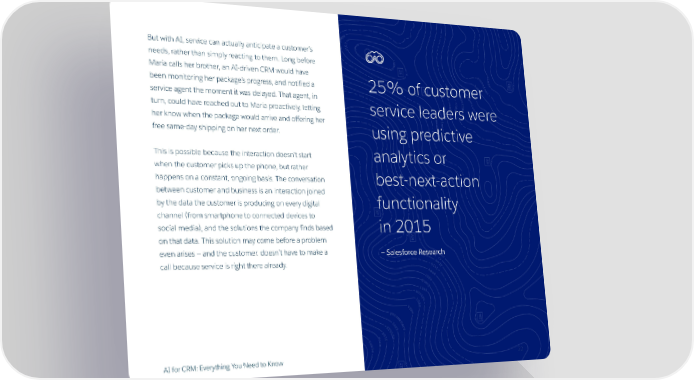 But with AI, service can actually anticipate a customer’s needs, rather than simply reacting to them. Long before Maria calls her brother, an AI-driven CRM would have been monitoring her package’s progress, and notified a 25% of customer service agent the moment it was delayed. That agent, in turn, could have reached out to Maria proactively, letting service leaders were her know when the package would arrive and offering her free same-day shipping on her next order. using predictive This is possible because the interaction doesn’t start analytics or when the customer picks up the phone, but rather happens on a constant, ongoing basis. The conversation best-next-action between customer and business is an interaction joined by the data the customer is producing on every digital functionality channel (from smartphone to connected devices to social media), and the solutions the company finds based in 2015 on that data. This solution may come before a problem even arises — and the customer. doesn’t have to make a — Salesforce Research call because service is right there already. AI for CRM: Everything You Need to Know 22