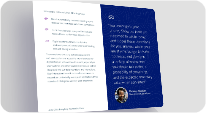 Salespeople will benefit from AI in three ways: Data is automatically captured, enabling reps to “Y ou could say to your discover best next steps and closest connections phone, ‘Show me leads I’m Predictive sales helps reps prioritize leads and supposed to talk to today,’ respond faster to high-value opportunities and it does those operations Digital assistants will help maintain the for you: analyzes which ones relationship once it’s established by scheduling calls and issuing reminders are at which stage, finds the The move toward making business applications hot leads, and gives you and sales tools more accessible and relevant to our a ranking of which ones digital lifestyles will continue to expand, especially as smartwatches and other wearable devices are further you should talk to first, a integrated into our daily operations and interactions. probability of converting, User-interaction time will shorten from minutes to seconds as contextually aware push notifications bring and the expected monetary speed and intelligence to every sales experience. value when converted.” Chalenge Masekera Data Scientist, Salesforce AI for CRM: Everything You Need to Know 20