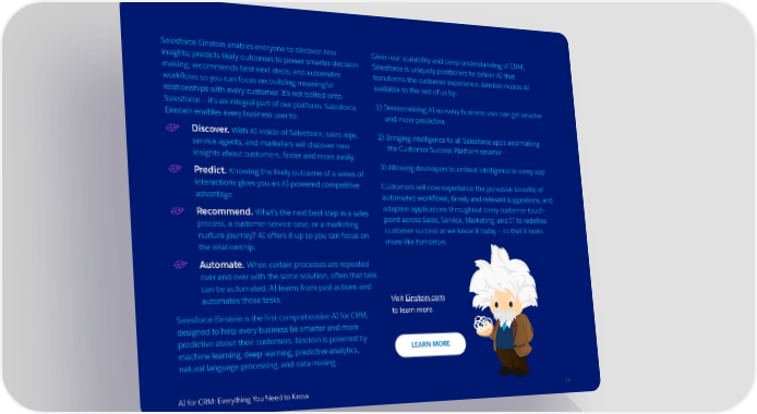 Salesforce Einstein enables everyone to discover new Given our scalability and deep understanding of CRM, insights; predicts likely outcomes to power smarter decision- Salesforce is uniquely positioned to deliver AI that making; recommends best next steps; and automates transforms the customer experience. Einstein makes AI workflows so you can focus on building meaningful available to the rest of us by: relationships with every customer. It’s not bolted onto Salesforce — it’s an integral part of our platform. Salesforce 1) Democratizing AI so every business user can get smarter Einstein enables every business user to: and more predictive Discover. With AI inside of Salesforce, sales reps, 2) Bringing intelligence to all Salesforce apps and making service agents, and marketers will discover new the Customer Success Platform smarter insights about customers, faster and more easily. Predict. Knowing the likely outcome of a series of 3) Allowing developers to embed intelligence in every app interactions gives you an AI-powered competitive Customers will now experience the pervasive benefits of advantage. automated workflows, timely and relevant suggestions, and Recommend. What’s the next best step in a sales adaptive applications throughout every customer touch- process, a customer service case, or a marketing point across Sales, Service, Marketing, and IT to redefine nurture journey? AI offers it up so you can focus on customer success as we know it today — so that it looks the relationship. more like tomorrow. Automate. When certain processes are repeated over and over with the same solution, often that task can be automated. AI learns from past actions and automates those tasks. Visit Einstein.com Salesforce Einstein is the first comprehensive AI for CRM, to learn more. designed to help every business be smarter and more predictive about their customers. Einstein is powered by machine learning, deep learning, predictive analytics, natural language processing, and data mining. AI for CRM: Everything You Need to Know 34