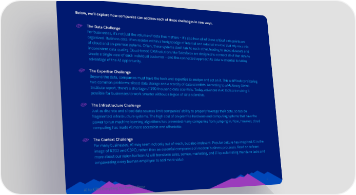 Below, we’ll explore how companies can address each of these challenges in new ways. The Data Challenge For businesses, it’s not just the volume of data that matters — it’s also how all of those critical data points are organized. Business data often resides within a hodgepodge of internal and external sources that rely on a mix of cloud and on-premise systems. Often, these systems don’t talk to each other, leading to siloed datasets and inconsistent data quality. Cloud-based CRM solutions like Salesforce are designed to connect all of that data to create a single view of each individual customer — and this connected approach to data is essential to taking advantage of the AI opportunity. The Expertise Challenge Beyond the data, companies must have the tools and expertise to analyze and act on it. This is difficult considering two common problems: siloed data storage and a scarcity of data scientists. According to a McKinsey Global Institute report, there’s a shortage of 190 thousand data scientists. Today, advances in AI tools are making it possible for businesses to work smarter without a legion of data scientists. The Infrastructure Challenge Just as discrete and siloed data sources limit companies’ ability to properly leverage their data, so too do fragmented infrastructure systems. The high cost of on-premise hardware and computing systems that have the power to run machine-learning algorithms has prevented many companies from jumping in. Now, however, cloud computing has made AI more accessible and affordable. The Context Challenge For many businesses, AI may seem not only out of reach, but also irrelevant. Popular culture has imagined AI in the image of R2D2 and C3PO, rather than an essential component of modern business processes. Read on to learn more about our vision for how AI will transform sales, service, marketing, and IT by automating mundane tasks and empowering every human employee to add more value. AI for CRM: Everything You Need to Know 14