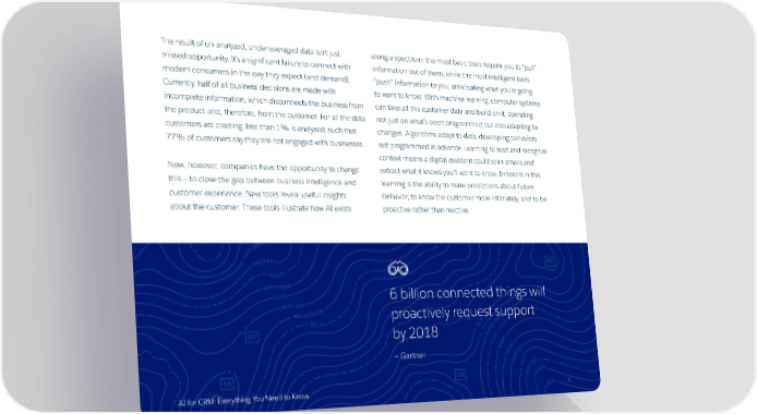 The result of un-analyzed, underleveraged data isn’t just along a spectrum: the most basic tools require you to “pull” missed opportunity. It’s a significant failure to connect with information out of them, while the most intelligent tools modern consumers in the way they expect (and demand). “push” information to you, anticipating what you’re going Currently, half of all business decisions are made with to want to know. With machine learning, computer systems incomplete information, which disconnects the business from can take all this customer data and build on it, operating the product and, therefore, from the customer. For all the data not just on what’s been programmed but also adapting to customers are creating, less than 1% is analyzed, such that changes. Algorithms adapt to data, developing behaviors 77% of customers say they are not engaged with businesses. not programmed in advance. Learning to read and recognize context means a digital assistant could scan emails and Now, however, companies have the opportunity to change extract what it knows you’ll want to know. Inherent in this this — to close the gap between business intelligence and learning is the ability to make predictions about future customer experience. New tools reveal useful insights behavior, to know the customer more intimately, and to be about the customer. These tools illustrate how AI exists proactive rather than reactive. 6 billion connected things will proactively request support by 2018 — Gartner AI for CRM: Everything You Need to Know 15