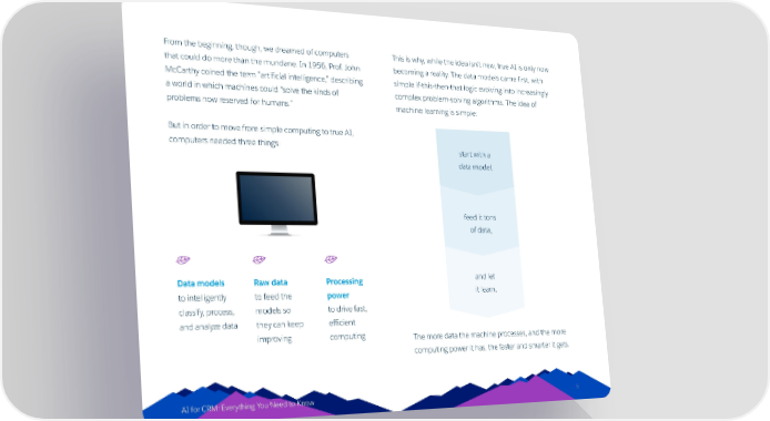From the beginning, though, we dreamed of computers This is why, while the idea isn’t new, true AI is only now that could do more than the mundane. In 1956, Prof. John becoming a reality. The data models came first, with McCarthy coined the term “artificial intelligence,” describing simple if-this-then-that logic evolving into increasingly a world in which machines could “solve the kinds of complex problem-solving algorithms. The idea of problems now reserved for humans.” machine learning is simple: But in order to move from simple computing to true AI, computers needed three things: start with a data model, feed it tons of data, Data models Raw data Processing and let to intelligently to feed the power it learn. classify, process, models so to drive fast, and analyze data they can keep efficient improving computing The more data the machine processes, and the more computing power it has, the faster and smarter it gets. AI for CRM: Everything You Need to Know 8