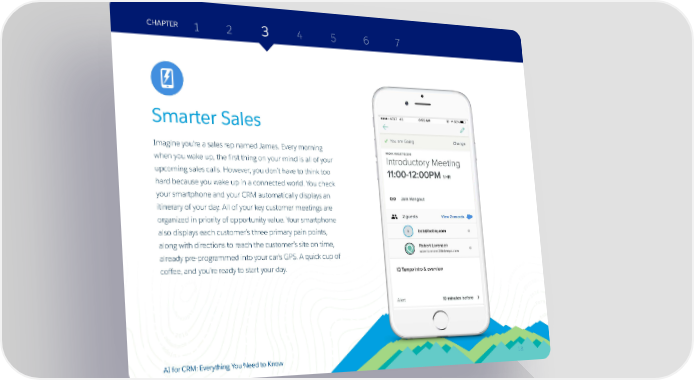 CHAPTER 1 2 3 4 5 6 7 Sales Smarter Sales Imagine you’re a sales rep named James. Every morning when you wake up, the first thing on your mind is all of your upcoming sales calls. However, you don’t have to think too hard because you wake up in a connected world. You check your smartphone and your CRM automatically displays an itinerary of your day. All of your key customer meetings are organized in priority of opportunity value. Your smartphone also displays each customer’s three primary pain points, along with directions to reach the customer’s site on time, already pre-programmed into your car’s GPS. A quick cup of coffee, and you’re ready to start your day. AI for CRM: Everything You Need to Know 1818