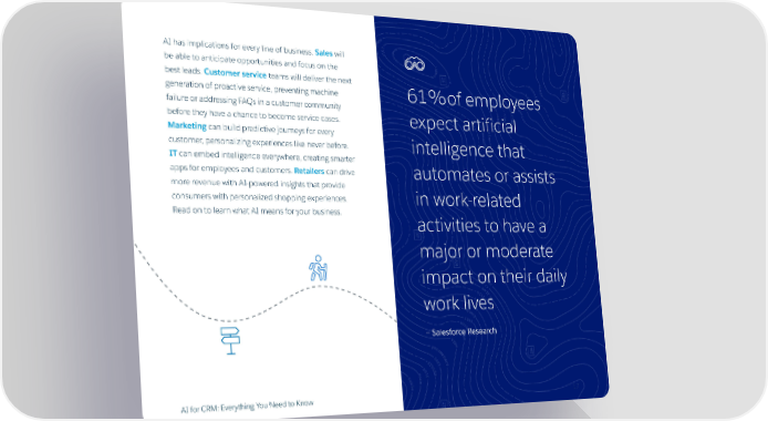 AI has implications for every line of business. Sales will be able to anticipate opportunities and focus on the best leads. Customer service teams will deliver the next generation of proactive service, preventing machine 61%of employees failure or addressing FAQs in a customer community before they have a chance to become service cases. expect artificial Marketing can build predictive journeys for every customer, personalizing experiences like never before. intelligence that IT can embed intelligence everywhere, creating smarter apps for employees and customers. Retailers can drive automates or assists more revenue with AI-powered insights that provide consumers with personalized shopping experiences. in work-related Read on to learn what AI means for your business. activities to have a major or moderate impact on their daily work lives — Salesforce Research AI for CRM: Everything You Need to Know 17