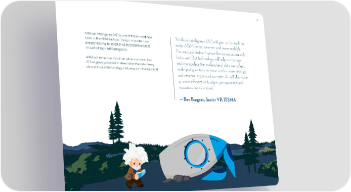 12 Artificial intelligence (AI) is one of the shiniest new “Artificial intelligence (AI) will give us the tools to tools in the ABM toolbox. Today’s marketers are make ABM faster, smarter, and more scalable. already looking to invest in AI to boost the future No, we can’t deliver human-like conversation with impact of their ABM programs. bots—yet. But technology will help us manage ABM will remain as much an art as a science, but and manipulate the avalanche of data we collect AI has great potential to streamline the data-heavy while giving us time to focus on the more strategic elements of ABM strategy and program development. and creative aspects of our jobs. AI will also make us more efficient as budgets get squeezed and resources kept constant.” — Bev Burgess, Senior VP, ITSMA