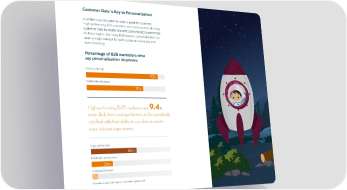 4 Customer Data is Key to Personalization A unified view of customer data is great for business. High-performing B2B marketers are more capable of using customer data to create relevant, personalized experiences for their buyers. For many B2B brands, personalization has been a major catalyst for both customer advocacy and brand building. Percentage of B2B marketers who say personalization improves: Brand building* 92% Customer advocacy* 81% High-performing B2B marketers are 9.4x more likely than underperformers to be completely satisfied with their ability to use data to create more relevant experiences. High performers 66% Moderate performers 26% Underperformers 7% *Includes answers of major or moderate improvement