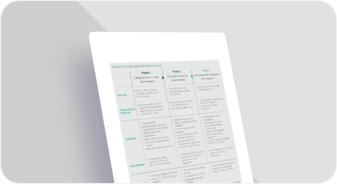 Exhibit 5 | Navigating the ABE Maturity Curve Phase 1 Phase 2 Phase 3 Getting the basics in place Scaling ABE capabilities Achieving operational integration 1 1 (48% of companies) (48% of companies) (4% of companies) • Focus on fewer accounts, • Expanding number of • Likely doing both strategic ABE Approach likely either one-to-one or accounts, adding elements and fully scaled ABE one-to-few ABE of scaled ABE • Marketing, sales and service • Marketing, sales, and service • Full, systematic marketing, sales, Organizational alignment on ABE objectives, coordinated execution and service integration alignment target accounts, and overall • ABE program office in place • Use of more centralized implementation plan approaches • Pilots launched • Building infrastructure to • More complex program • Marketing, sales, and service scale, e.g. tech, data, content, management coordinating, but still manual processes • Fully integrated tech and • Sales-driven account • Use of buying committee processes with integrated Operations prioritization targeting customer data • Bottom of funnel focus; still • Use of predictive models for • Greater use of data/tech for lead oriented, aggregating by account prioritization real-time, personalized account • Advanced web/email engagement • Basic web/email personalization personalization with greater • Full funnel omnichannel digital omnichannel optimization and offline optimization • Leveraging marketing • Using account-based ads, web • Use of integrated tools and data to Tech platforms automation, CRM, and personalization, and sales enable account-based lead-to-account mapping automation to scale orchestration engagement • Campaign/engagement focused • Goal achievement for target • Revenue tracking with advanced • Progress on data cleaning and accounts attribution to measure ABE Measurement integration • Cross-funnel measurement program ROI across activities • Rules-based attribution modeling • Increased account engagement • Demonstrable impact on • New growth trajectory for business and sales interactions revenue growth at priority • Increased share of wallet, higher Results • Initial impacts on deal velocity accounts customer satisfaction, and greater and pipeline growth • Improving win rate and lifetime value average deal size Sources: BCG discussions with B2B marketing and sales executives, Sep 2019-Jan 2020; BCG case experience. 1 Percentage of companies interviewed as a part the study at each stage of maturity. By now, marketing, sales, and service are coordinating operational activities more effectively. Companies have also started putting the infrastructure in place, consist- ing of the initial efforts to build and integrate the technology stack, implementing more sophisticated data management and integration approaches, creating scalable content processes, and linking activities and communications across functions. Do- ing so provides more sophisticated capabilities, such as the ability to generate in- Boston Consulting Group 13