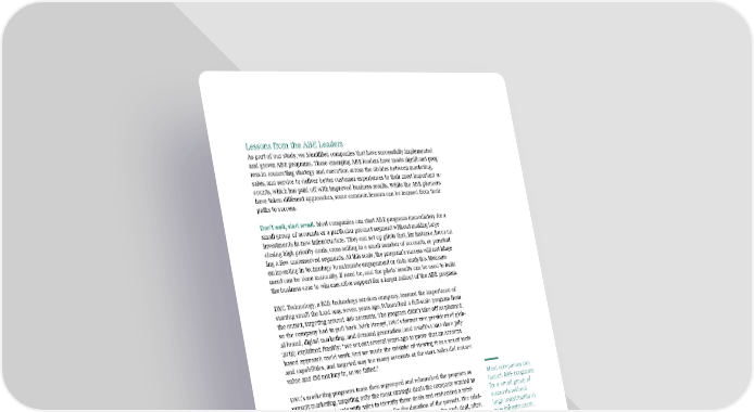 Lessons from the ABE Leaders As part of our study, we identified companies that have successfully implemented and grown ABE programs. These emerging ABE leaders have made significant prog- ress in connecting strategy and execution across the divides between marketing, sales, and service to deliver better customer experiences to their most important ac- counts, which has paid off with improved business results. While the ABE pioneers have taken different approaches, some common lessons can be learned from their paths to success. Don’t wait; start small. Most companies can start ABE programs immediately for a small group of accounts or a particular product segment without making large investments in new infrastructure. They can set up pilots that, for instance, focus on closing high-priority deals, cross-selling in a small number of accounts, or penetrat- ing a few underserved segments. At this scale, the program’s success will not hinge on investing in technology to automate engagement or data analytics. Measure- ment can be done manually, if need be, and the pilots’ results can be used to build the business case to win executive support for a larger rollout of the ABE program. DXC Technology, a B2B technology services company, learned the importance of starting small the hard way. Seven years ago, it launched a full-scale program from the outset, targeting around 400 accounts. The program didn’t take off as planned, so the company had to pull back. Nick Panayi, DXC’s former vice president of glob- al brand, digital marketing, and demand generation (and IPsoft’s CMO since July 2019) explained frankly: “We set out several years ago to prove that an account- based approach could work. But we made the mistake of viewing it as a set of tools and capabilities, and targeted way too many accounts at the start. Sales did not see value and did not buy in, so we failed.” DXC’s marketing programs team then regrouped and relaunched the program as Most companies can pursuit marketing, targeting only the most strategic deals the company wanted to launch ABE programs close. It worked closely with sales to identify those deals and embedded a mini- for a small group of chief marketing officer in each deal team for the duration of the pursuit. The mini- accounts without CMO acted as the point of contact for building custom content for each deal, often large investments in using customized microsites. Over time, DXC saw web traffic from the strategic ac- new infrastructure. counts rise by 33%. As sales increasingly bought into ABE, and as deal win rates in- creased, sales gave marketing a 99% approval rating on value created. Now, DXC is planning to scale its ABE program to cover 80 accounts, using its earlier invest- ments and learnings to ensure success. Align on goals; stage the rollout. The launch of every ABE program should start by ensuring a match between a company’s ideal customer profile and the total ad- dressable market. In doing this, companies must develop a list of specific ac- counts—and the people at those accounts—that companies should target. Not targeting the right accounts means precious sales and marketing resources will be wasted in pursuit of the wrong targets. Then, companies must develop data-driven insights about customer buying behav- iors and pain points, which should inform the goals and strategies for each account. It’s also critical to gain alignment across marketing, sales, and service to determine Boston Consulting Group 15