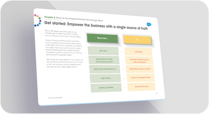 Chapter 4: Move to the Leanest Possible Technology Stack Get started: Empower the business with a single source of truth While a 360-degree view of the customer is an incredible goal, it’s difficult to achieve. The sheer volume of data you could include is virtually endless. Move from... To... Instead of being overwhelmed by the possibilities, focus on building a clear and easy-to-read customer profile. Begin the continuous approach to building an ever-deeper view of your customer and the context for their relationship with you. Empower as many ERP-centric CRM-centric employees as possible to see this source of truth and use it to serve the customer’s needs. Talk through this “move away from” and “move to” list Separate technical debt Combined budgets focused on with your team and discuss how you can focus more and innovation line items customer experience on tech that improves customer experiences and leave behind not-so-helpful legacy systems. Projects led by departments or IT Projects led by customer centricity Large releases Smaller, more frequent releases Steering committiees Partner with end users The Customer 360 Playbook 16
