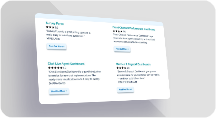 Survey Force Omni-Channel Performance Dashboard 3.0 4.0 “Survey Force is a great polling app and is Omni-Channel Performance Dashboard helps really easy to install and customize.” you understand agent productivity and workload MIKE LANE so you can provide effective coaching. Find Out More > Find Out More > Chat Live Agent Dashboard Service & Support Dashboards 5.0 4.0 “Chat Live Agent Dashboard is a good introduction “Service & Support Dashboards give you an to metrics for new chat implementations. The excellent base for your customer service metrics ready-made visualization made it easy to modify.” — and then build it from there.” DHARA GARG JENNIFER NELSON Find Out More > Find Out More >