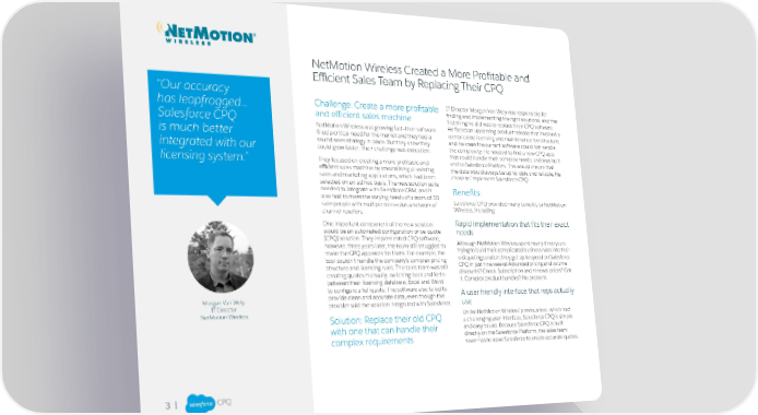 NetMotion Wireless Created a More Profitable and Efficient Sales Team by Replacing Their CPQ “Our accuracy has leapfrogged... Challenge: Create a more profitable IT Director Morgan Van Wely was responsible for and efficient sales machine finding and implementing the right solutions, and the Salesforce CPQ first thing he did was to replace their CPQ software. NetMotion Wireless was growing fast—their software He faced an upcoming product release that involved a is much better filled a critical need for the market and they had a complicated licensing and maintenance fee structure, sound sales strategy in place. But they knew they and he knew the current software could not handle integrated with our could grow faster. Their challenge was execution. the complexity. He needed to find a new CPQ app that could handle their complex needs, and was built licensing system.” They focused on creating a more profitable and on the Salesforce Platfom. This would ensure that efficient sales machine by streamlining all existing the data would always be up-to-date and reliable. He sales and marketing applications, which had been chose to implement Salesforce CPQ. selected on an ad hoc basis. The new solution suite needed to integrate with Salesforce CRM, and it Benefits: also had to meet the varying needs of a team of 30 Salesforce CPQ provided many benefits to NetMotion salespeople with multiple roles—plus a network of Wireless, including: channel resellers. One important component of the new solution Rapid implementation that fits their exact would be an automated configuration-price-quote needs (CPQ) solution. They implemented CPQ software, Although NetMotion Wireless spent nearly three years however, three years later, the team still struggled to trying to build their complicated business rules into their make the CPQ app work for them. For example, the old quoting solution, they got up to speed on Salesforce tool couldn’t handle the company’s complex pricing CPQ in just nine weeks! Advanced pricing and volume structure and licensing rules. The sales team was still discounts? Check. Subscription and renewal prices? Got creating quotes manually, switching back and forth it. Complex product bundles? No problem. between their licensing database, Excel and Word to configure a full quote. The software also failed to A user-friendly interface that reps actually Morgan Van Wely provide clean and accurate data, even though the use IT Director provider said the solution integrated with Salesforce. NetMotion Wireless Solution: Replace their old CPQ Unlike NetMotion Wireless’ previous tool, which had a challenging user interface, Salesforce CPQ is simple with one that can handle their and easy to use. Because Salesforce CPQ is built complex requirements directly on the Salesforce Platform, the sales team never has to leave Salesforce to create accurate quotes. 3 |