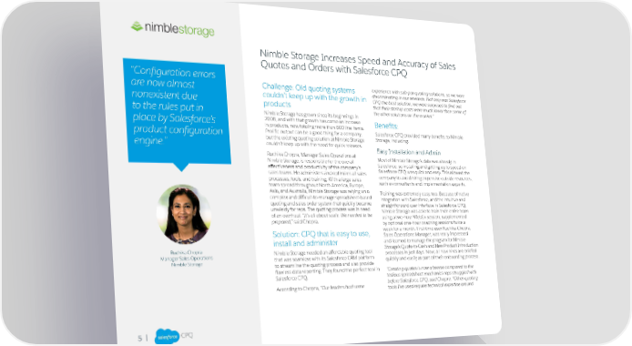 Nimble Storage Increases Speed and Accuracy of Sales Quotes and Orders with Salesforce CPQ “Configuration errors are now almost Challenge: Old quoting systems experience with sub-par quoting solutions, so we were couldn’t keep up with the growth in discriminating in our research. Not only was Salesforce nonexistent due CPQ the best solution, we were surprised to find out products that their startup costs were much lower than some of to the rules put in Nimble Storage has grown since its beginnings in the other solutions on the market.” place by Salesforce’s 2008, and with that growth has come an increase Benefits: in products, now totaling more than 600 line items. product configuration Prolific output can be a good thing for a company, Salesforce CPQ provided many benefits to Nimble but the existing quoting solution at Nimble Storage Storage, including: engine.” couldn’t keep up with the need for quick releases. Easy Installation and Admin Ruchika Chopra, Manager Sales Operations at Most of Nimble Storage’s data was already in Nimble Storage, is responsible for the overall Salesforce, so installing and getting up to speed on effectiveness and productivity of the company’s Salesforce CPQ was quick and easy. This allowed the sales teams. He administers and optimizes all sales company to avoid hiring expensive outside resources, processes, tools, and training. With a large sales such as consultants and implementation experts. team spread throughout North America, Europe, Asia, and Australia, Nimble Storage was relying on a Training was extremely easy, too. Because of native complex and difficult-to-manage spreadsheet-based integration with Salesforce, and the intuitive and quoting and sales order system that quickly became straightforward user interface in Salesforce CPQ, unwieldy for reps. The quoting process was in need Nimble Storage was able to train their entire team of an overhaul. “It’s all about scale. We needed to be using a two-hour WebEx session, supplemented prepared,” said Chopra. by optional one-hour coaching sessions twice a Solution: CPQ that is easy to use, week for a month. First-time user Ruchika Chopra, Sales Operations Manager, was really impressed install and administer and learned to manage the program for Nimble Ruchika Chopra Nimble Storage needed an affordable quoting tool Storage’s Quote-to-Cash and New Product Introduction Manager Sales Operations that was seamless with its Salesforce CRM platform processes in just days. Now, all new hires are briefed Nimble Storage to streamline the quoting process and also provide quickly and easily as part of their onboarding process. flawless data reporting. They found the perfect tool in “Creating quotes is now a breeze compared to the Salesforce CPQ. tedious spreadsheet mechanics reps struggled with According to Chopra, “Our leaders had some before Salesforce CPQ, said Chopra. “Other quoting tools I’ve used require technical expertise around 5 |
