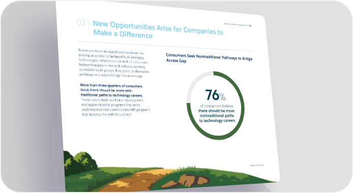 Ethical Leadership and Business | 13 03 | New Opportunities Arise for Companies to Make a Difference Businesses have an opportunity to ensure fair Consumers Seek Nontraditional Pathways to Bridge and equal access to the benefits of emerging Access Gap technologies. While less than half of consumers believe that jobs in the tech industry are fairly accessible to all groups, they point to alternative pathways as a way to bridge the access gap. More than three-quarters of consumers think there should be more non- traditional paths to technology careers. 76% These can include workforce development and apprenticeship programs that serve of consumers believe underrepresented communities with programs there should be more that develop the skills to succeed. nontraditional paths to technology careers Salesforce Research