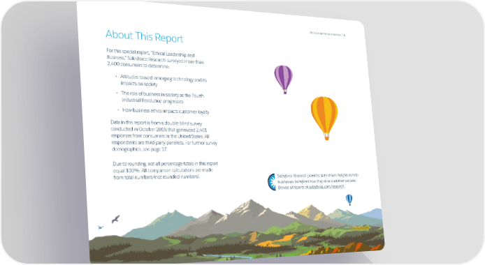 Ethical Leadership and Business | 1 About This Report For this special report, “Ethical Leadership and Business,” Salesforce Research surveyed more than 2,400 consumers to determine: • Attitudes toward emerging technology and its impacts on society • The role of business in society as the Fourth Industrial Revolution progresses • How business ethics impacts customer loyalty Data in this report is from a double-blind survey conducted in October 2018 that generated 2,401 responses from consumers in the United States. All respondents are third-party panelists. For further survey demographics, see page 17. Due to rounding, not all percentage totals in this report equal 100%. All comparison calculations are made from total numbers (not rounded numbers). Salesforce Research provides data-driven insights to help businesses transform how they drive customer success. Browse all reports at salesforce.com/research. SalesforSalesforcce Re Researesearchch