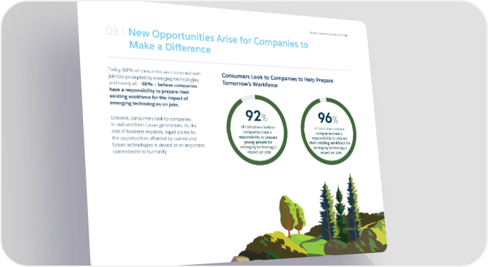 Ethical Leadership and Business | 14 03 | New Opportunities Arise for Companies to Make a Difference Today, 88% of consumers are concerned with Consumers Look to Companies to Help Prepare job loss prompted by emerging technologies, Tomorrow’s Workforce and nearly all — 96% — believe companies have a responsibility to prepare their existing workforce for the impact of emerging technologies on jobs. 92% 96% Likewise, consumers look to companies to skill and train future generations. As the of consumers believe of consumers believe role of business expands, equal access to companies have a companies have a the opportunities afforded by current and responsibility to prepare responsibility to prepare future technologies is viewed as an important young people for their existing workforce for emerging technology’s emerging technology’s commitment to humanity. impact on jobs impact on jobs SalesforSalesforcce Re Researesearchch