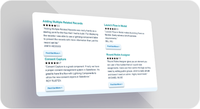 Adding Multiple Related Records Launch Flow in Modal 5.0 4.6 “Adding Multiple Related Records was really handy as a “Launch Flow in Modal makes launching flows so starting point for the flow that I had to build. For displaying flexible. Easily solves a lot of business the records I was able to use a lightning component table requirements.” to present the records with more information than just the BILL WU record set list.” Find Out More > ANITA HEDGES Find Out More > Round Robin Assigner SEE ALL SALESFORCE 4.8 Consent Capture LAB FLOWS HERE “Round Robin Assigner gives you an element you 4.7 can use in flow builder that will round-robin “Consent Capture is a great component. Finally we have assignments. Users can then control the logic as they a proper consent management system in Salesforce. It's need by editing public groups, which is really simple great to have this flow with Lightning Components to and doesn’t need an admin. Highly recommend.” utilize the new consent objects in Salesforce.” MICHAEL MUSE ROY RUSTEN Find Out More > Find Out More >