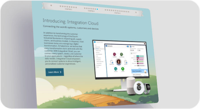 CHAPTER 1 CHAPTER 2 CHAPTER 3 Introducing: Integration Cloud Connecting the world’s systems, customers and devices In addition to transforming the customer experience, the technology of the Fourth Industrial Revolution is impacting job, supply chains, and business models. In response, most businesses today are undergoing a digital transformation. At Salesforce, we believe that every transformation starts and ends with the customer. With Integration Cloud, you can connect every system, device, and customer to your applications — regardless of where the data resides. Integration Cloud empowers you to connect systems to drive intelligent, personalised customer experiences. Learn More