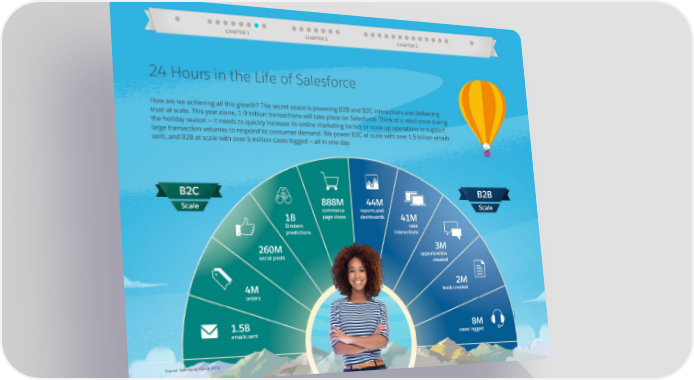 CHAPTER 1 CHAPTER 2 CHAPTER 3 24 Hours in the Life of Salesforce How are we achieving all this growth? The secret sauce is powering B2B and B2C interactions and delivering trust at scale. This year alone, 1.9 trillion transactions will take place on Salesforce. Think of a retail store during the holiday season — it needs to quickly increase its online marketing tactics or scale up operations to support large transaction volumes to respond to consumer demand. We power B2C at scale with over 1.5 billion emails sent, and B2B at scale with over 5 million cases logged — all in one day. 888M 44M commerce reports and 1B page views dashboards 41M Einstein case predictions interactions 260M 3M social posts opportunities created 4M 2M orders leads created 1.5B 8M emails sent cases logged Source: Salesforce, March 2018