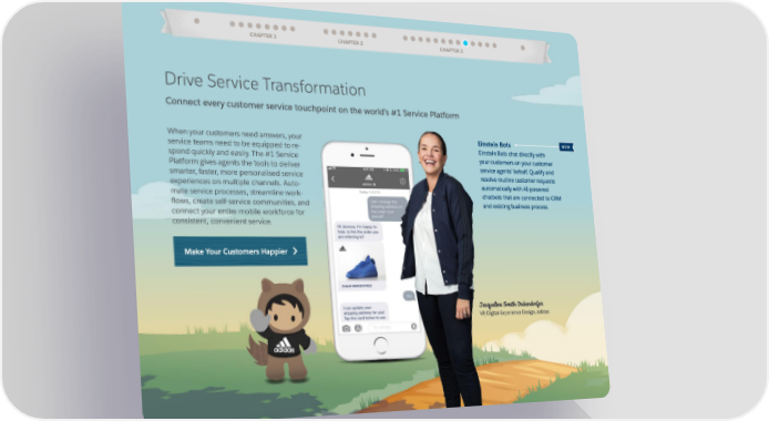 CHAPTER 1 CHAPTER 2 CHAPTER 3 When your customers need answers, your NEW service teams need to be equipped to re- spond quickly and easily. The #1 Service Platform gives agents the tools to deliver smarter, faster, more personalised service experiences on multiple channels. Auto- mate service processes, streamline work- flows, create self-service communities, and connect your entire mobile workforce for consistent, convenient service.
