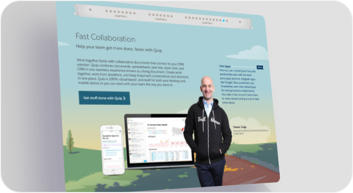 CHAPTER 1 CHAPTER 2 CHAPTER 3 Fast Collaboration Help your team get more done, faster with Quip Work together faster with collaborative documents that connect to your CRM Live Apps NEW solution. Quip combines documents, spreadsheets, task lists, team chat, and Now you can connect your favourite CRM in one seamless experience known as a living document. Create work productivity suite with the third- together, work from anywhere, and keep important conversations and decisions party apps you love. Integrate apps in one place. Quip is 100% cloud-based and built for both your desktop and like Google Drive, Lucidchart, Jira, mobile device so you can work with your team the way you want to. Smartsheet, and more within Quip for next-generation collaboration. Your data is live, so you’ll never have Get stuff done with Quip to worry about looking at out-of-date information. Damien Judge Head of Business Commercial Excellence, Ulster Bank