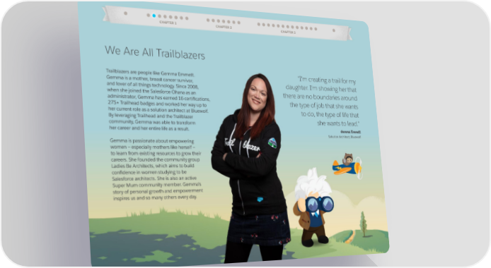 CHAPTER 1 CHAPTER 2 CHAPTER 3 We Are All Trailblazers Trailblazers are people like Gemma Emmett. "I'm creating a trail for my Gemma is a mother, breast cancer survivor, daughter. I'm showing her that and lover of all things technology. Since 2008, when she joined the Salesforce Ohana as an there are no boundaries around administrator, Gemma has earned 16 certifications, the type of job that she wants 275+ Trailhead badges and worked her way up to her current role as a solution architect at Bluewolf. to do, the type of life that By leveraging Trailhead and the Trailblazer she wants to lead." community, Gemma was able to transform her career and her entire life as a result. Gemma Emmett Solution Architect, Bluewolf Gemma is passionate about empowering women — especially mothers like herself — to learn from existing resources to grow their careers. She founded the community group Ladies Be Architects, which aims to build confidence in women studying to be Salesforce architects. She is also an active Super Mum community member. Gemma’s story of personal growth and empowerment inspires us and so many others every day.