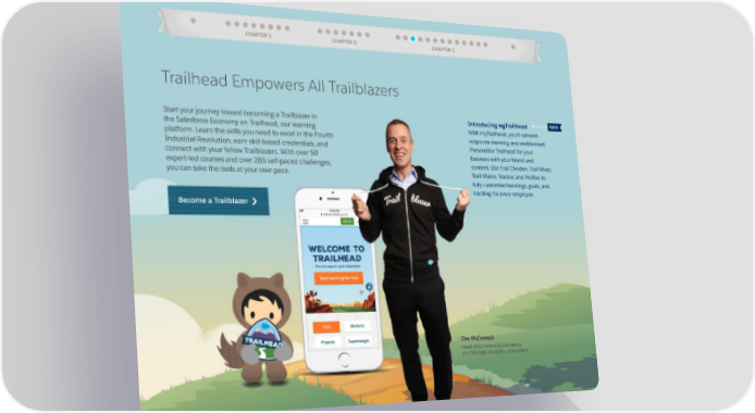 CHAPTER 1 CHAPTER 2 CHAPTER 3 Trailhead Empowers All Trailblazers Start your journey toward becoming a Trailblazer in Introducing myTrailhead NEW the Salesforce Economy on Trailhead, our learning With myTrailhead, you’ll reinvent platform. Learn the skills you need to excel in the Fourth corporate learning and enablement. Industrial Revolution, earn skill-based credentials, and Personalise Trailhead for your connect with your fellow Trailblazers. With over 50 business with your brand and expert-led courses and over 285 self-paced challenges, content. Use Trail Checker, Trail Mixer, you can take the trails at your own pace. Trail Maker, Tracker, and Profiles to fully-customise learnings, goals, and tracking for every employee. Become a Trailblazer Jim McCormick Head of Commercial Excellence and Strategic Analytics, Ulster Bank
