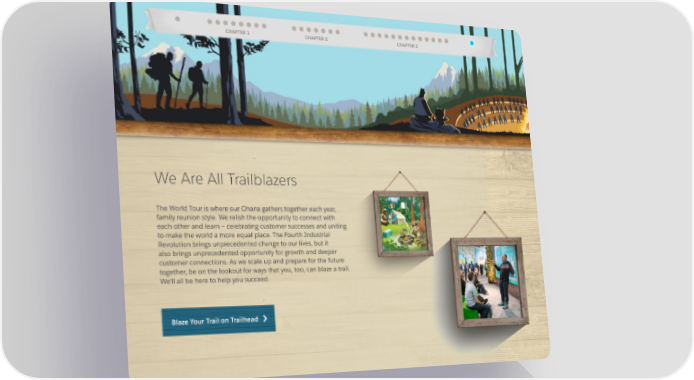 CHAPTER 1 CHAPTER 2 CHAPTER 3 We Are All Trailblazers The World Tour is where our Ohana gathers together each year, family reunion style. We relish the opportunity to connect with each other and learn — celebrating customer successes and uniting to make the world a more equal place. The Fourth Industrial Revolution brings unprecedented change to our lives, but it also brings unprecedented opportunity for growth and deeper customer connections. As we scale up and prepare for the future together, be on the lookout for ways that you, too, can blaze a trail. We’ll all be here to help you succeed. Blaze Your Trail on Trailhead
