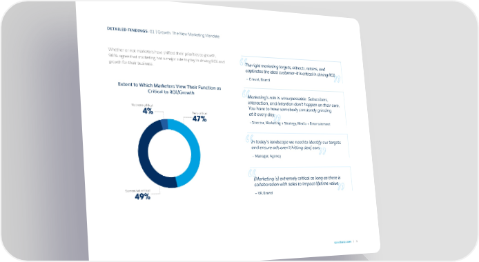DETAILED FINDINGS: 01 | Growth: The New Marketing Mandate Whether or not marketers have shifted their priorities to growth, 96% agree that marketing has a major role to play in driving ROI and The right marketing targets, attracts, retains, and growth for their business. captivates the ideal customer—it is critical in driving ROI. “ — C-level, Brand Extent to Which Marketers View Their Function as Critical to ROI/Growth Marketing’s role is unsurpassable. Subscribers, interaction, and intention don’t happen on their own. Not very critical You have to have somebody constantly grinding “ 4% Very critical at it every day. 47% —Director, Marketing + Strategy, Media + Entertainment In today's landscape we need to identify our targets and ensure ads aren't hitting deaf ears. “ — Manager, Agency [Marketing is] extremely critical as long as there is collaboration with sales to impact lifetime value. Somewhat critical “ 49% — VP, Brand salesforce.com 6