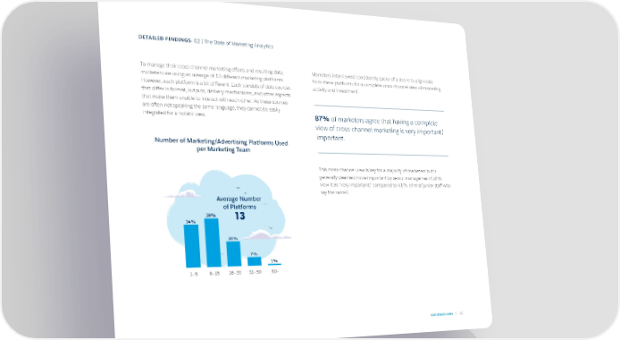 DETAILED FINDINGS: 02 | The State of Marketing Analytics To manage their cross-channel marketing efforts and resulting data, Marketers interviewed consistently spoke of a desire to align data marketers are using an average of 13 different marketing platforms. from these platforms for a complete cross-channel view of marketing However, each platform is a bit different. Each consists of data sources activity and investment. that differ in format, outputs, delivery mechanisms, and other aspects that make them unable to interact with each other. As these sources are often not speaking the same language, they cannot be easily integrated for a holistic view. 87% of marketers agree that having a complete view of cross-channel marketing is very important/ important. Number of Marketing/Advertising Platforms Used per Marketing Team This cross-channel view is key for a majority of marketers but is generally deemed more important by senior management (58% view it as "very important," compared to 41% of mid/junior sta昀昀 who say the same). Average Number of Platforms 39% 13 34% 20% 7% 1% 1–5 6–15 16–30 31–50 50+ salesforce.com 12
