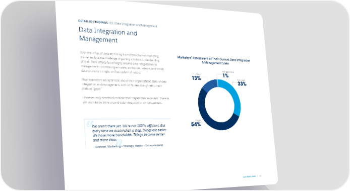 DETAILED FINDINGS: 03 | Data Integration and Management Data Integration and Management With the influx of data stemming from cross-channel marketing, Marketers’ Assessment of Their Current Data Integration marketers face the challenge of gaining a holistic understanding & Management State of it all. Their efforts focus largely around data integration and management — combining accurate, accessible, reliable, and timely Not applicable data to create a single, unified system of record. Poor 1% 13% Excellent Most marketers are optimistic about their organization's state of data 33% integration and management, with 54% describing their current state as “good.” However, only one-third consider their capabilities “excellent.” There is still work to be done around data integration and management. Good We aren’t there yet. We’re not 100% efficient. But 54% every time we accomplish a step, things are easier. We have more bandwidth. Things become better “ and more clear. — Director, Marketing + Strategy, Media + Entertainment salesforce.com 13