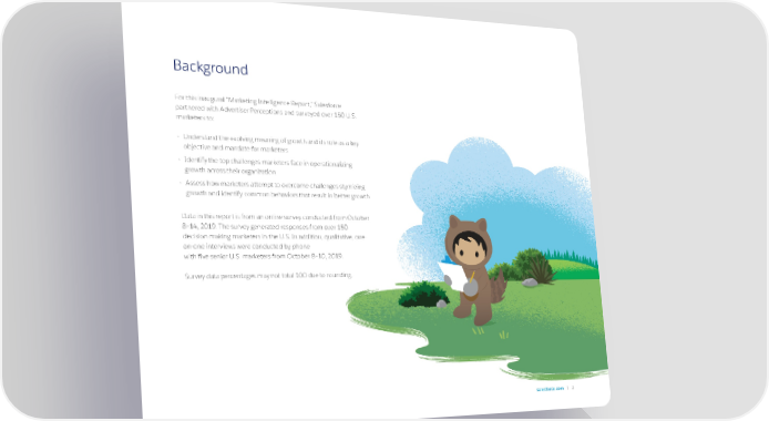 Background For this inaugural "Marketing Intelligence Report," Salesforce partnered with Advertiser Perceptions and surveyed over 150 U.S. marketers to: • Understand the evolving meaning of growth and its role as a key objective and mandate for marketers • Identify the top challenges marketers face in operationalizing growth across their organization • Assess how marketers attempt to overcome challenges stymieing growth and identify common behaviors that result in better growth Data in this report is from an online survey conducted from October 8–14, 2019. The survey generated responses from over 150 decision-making marketers in the U.S. In addition, qualitative, one- on-one interviews were conducted by phone with five senior U.S. marketers from October 8–10, 2019. Survey data percentages may not total 100 due to rounding. salesforce.com 2