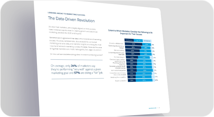 LOOKING AHEAD TO MARKETING SUCCESS: The Data-Driven Revolution It’s clear that marketers, while largely aligned on their purpose, Extent to Which Marketers Consider the Following to Be have immense opportunities for creating growth and data-driven Important for Their Success marketing practices for 2020 and beyond. Marketers are in agreement that data is the cornerstone of marketing Very Important Important Not Important success. Accurate, validated data, data accessibility, connected Accurate, validated data 64% 33% 3% marketing and sales data, and real-time insights are among the most Optimizing the marketing 59% 35% 6% important factors to marketing success. However, these are the same budget things that marketers are most challenged by (see pages 11 and 14). Data accessibility 52% 43% 5% Connecting marketing and 52% 44% 4% So how well are marketers doing when it comes to achieving success? sales data Real-time insights 44% 44% 11% Consistent measurement 39% 54% 7% and/or taxonomy Providing visibility to 38% 55% 7% leadership On average, only 34% of marketers say Centralizing data across all 35% 58% 7% they’re performing “very well” against a given channels/sources Technical skills/expertise 35% 60% 5% marketing goal and 57% are doing a “fair” job. Interactive views of all your 31% 59% 9% data across channels Analyzing the competition 29% 59% 12% Report automation 28% 62% 10% salesforce.com 19