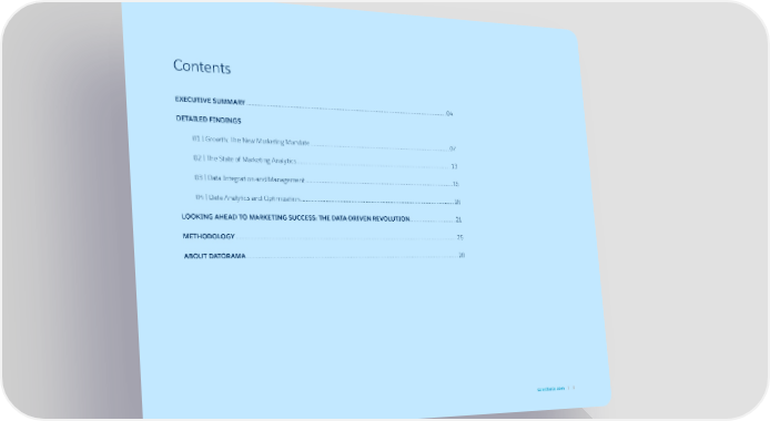 Contents EXECUTIVE SUMMARY ........................................................................................................................................ 04 DETAILED FINDINGS 01 | Growth: The New Marketing Mandate .................................................................................................07 02 | The State of Marketing Analytics .......................................................................................................... 13 03 | Data Integration and Management ......................................................................................................15 04 | Data Analytics and Optimization ..........................................................................................................18 LOOKING AHEAD TO MARKETING SUCCESS: THE DATA-DRIVEN REVOLUTION .................................21 METHODOLOGY .................................................................................................................................................... 25 ABOUT DATORAMA ...............................................................................................................................................28 salesforce.com 3
