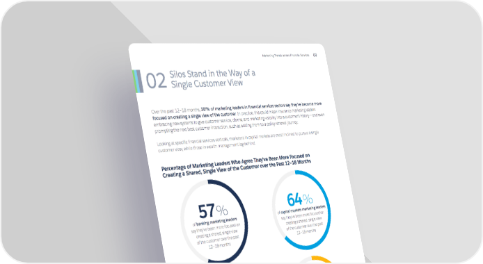 Marketing Trends across Financial Services 09 Silos Stand in the Way of a Single Customer View Over the past 12-18 months, 58°/o of marketing leaders in financial services sectors say they've become more focused on creating a single view of the customer . In practice, this could mean insurance marketing leaders embracing new systems to give customer seNice, claims, and marketing visibility into a customer's history-and even prompting the next best cu stomer interaction, such as adding them to a policy renewal journey. Looking at specific financial seNices verticals, marketers in capital markets are most inclined to pursue a single customer vi ew, while those in wealth management lag behind. Percentage of Marketing Leaders Who Agree They've Been More Focused on Creating a Shared, Single View of the Customer over the Past 12-18 Months 7°/o 4 °/o of banking marketing leade rs of capital markets marketing leaders say they've been more focused on say they've been more focused on creating a shared, single view creating a shared, single view of the customer over the past of the customer over the past 12-18 months 12-18 months 1°/o 47°/o of insurance marke ting leaders of wea lth management and other say they've been more focused on financial services* marketing leaders creating a shared, single view say they've been more focused on of the customer over the past creating a shared, single view 12-18 months of the customer over the past 12-18 months • "Other financial services" includes survey respondents who identified as other financial services financial planners, investment managers, actuaries, and accountants). professionals (e.g., Salesforce Research