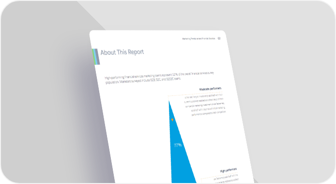 Marketing Trends across Financial Services 03 About This Report High-performing financial services marketing teams represent 12% of the overall financial services survey population. Marketers surveyed include B2B, B2C, and B2B2C teams. Moderate performers either are "very or moderately satisfied" with their current outcomes realized as a direct result of their company's marketing investment or are "extremely satisfied" with it but not with their marketing performance compared to their competitors Underperformers High performers . . . . . . . . . . . . . . . . . . . . . . . . . . . . ' # • • • • • • • • • • • • • • • • • • • • • • • • • • • • • • • are "slightly or not at all satisfied" with are "extremely satisfied" with the the current outcomes realized as a current outcomes realized as a direct direct result of t result of heir company's their company's marketing marketing investment investment Salesforce Research