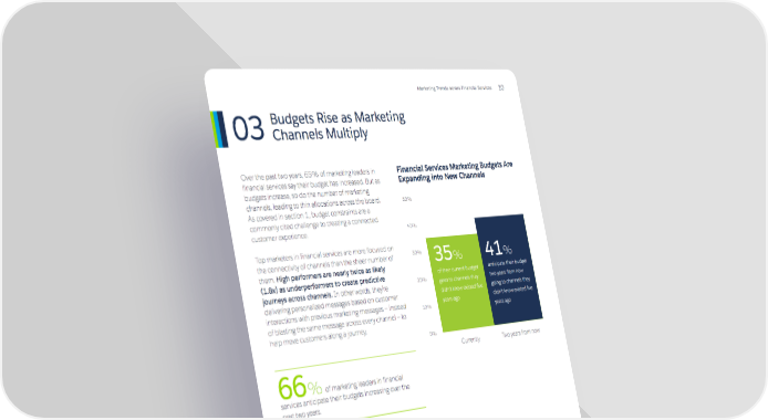 Marketing Trends across Financial Services 10 Budgets Rise as Marketing Channels Multiply Over the past two years, 65% of marketing leade rs in Financial Services Marketing Budgets Are fi nancial services say their budget has increase d. But as New Channels Expanding into budgets increase, so do the number of marketing channels, l eading to thin allocations across the board. 50% As cove red in section 1, budget constraints are a commonly cited challenge to creating a connected customer 400/o expe rience. Top marketers in financial services are more focused on the 30% connectivity of channels than the sheer number of 41°/o them. High performers are nearly twice as likely (1.8x) as underpe rformers to crea te predictive of their current budget anticipate their budget 20% to channels t two years from now journeys across channels. In other words, they're goes deli didn't know existed five going to channels they vering personalized messages based on customer inter didn't know existed five actions with previous marketing messages-instead 10% of blast ing the same message across every channel - to years ago help move customers along a JOurney ()O/o Currently Two years from now 0 /o of marketing leaders in financial services anticipate their budgets increasing over the next two years.