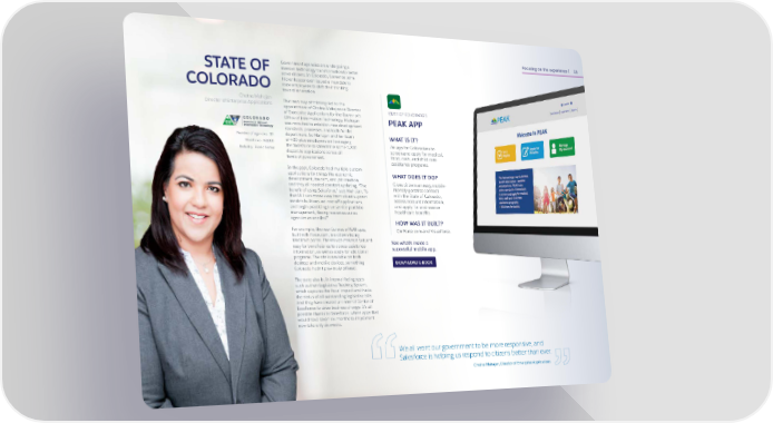 Focusing on the experience 15 Government agencies are undergoing a STATE OF massive technology transformation to better serve citizens. In Colorado, Governor John Hickenlooper even issued a mandate to COLORADO state employees to shift their thinking toward innovation. Chetna Mahajan That new way of thinking led to the Director of Enterprise Applications appointment of Chetna Mahajan as Director of Enterprise Applications for the Governor’s STATE OF COLORADO’S Office of Information Technology. Mahajan PEAK APP was recruited to establish new development standards, processes, and tools for the Number of agencies: 19 department. So Mahajan and her team WHAT IS IT? Workforce: 40,000 of 400-plus employees are leveraging An app for Coloradans to Industry: Public Sector the Salesforce to streamline some 1,200 screen and apply for medical, disparate applications across all food, cash, and child care levels of government. assistance programs. In the past, Colorado had multiple custom applications for things like economic WHAT DOES IT DO? development, tourism, and job creation, Gives citizens an easy, mobile- and they all needed constant updating. “The friendly portal to connect benefit of using Salesforce,” says Mahajan, “is with the State of Colorado, that OIT can move away from siloed support access account information, models built around one-off applications, and apply for and receive and begin practicing true service portfolio management, flexing resources across healthcare benefits. agencies as needed.” HOW WAS IT BUILT? For example, the new Colorado PEAK app, On Force.com and Visualforce. built with Force.com, is a citizen-facing Medicaid portal. The service makes it fast and See what’s inside a easy for beneficiaries to access assistance successful mobile app. information, as well as apply for additional programs. The site is available on both desktop and mobile devices, something DOWNLOAD E-BOOK Colorado hadn’t previously offered. The state also built internal facing apps such as their Legislative Tracking System, which captures the fiscal impact and tracks the status of all outstanding legislative bills. And they have created an internal Center of Excellence to drive business change. It’s all possible thanks to Salesforce, where apps that would have taken six months to implement now take only six weeks. We all want our government to be more responsive, and Salesforce is helping us respond to citizens better than ever. Chetna Mahajan, Director of Enterprise Applications