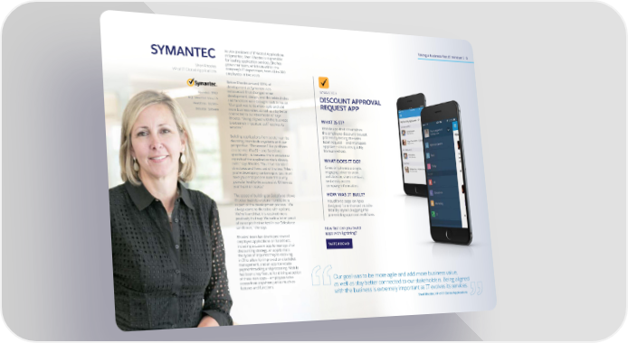 Taking a business-first IT mindset 6 As vice president of IT Global Applications SYMANTEC at Symantec, Sheri Rhodes is responsible for leading application services. She has Sheri Rhodes grown her team, which sits within the VP of IT Global Applications company’s IT department, from 40 to 300 employees in two years. Before Rhodes arrived, 95% of development at Symantec was SYMANTEC’S Founded: 1983 outsourced. That changed when development, design, and the related roles DISCOUNT APPROVAL HQ: Mountain View, CA and functions were brought back in house. Workforce: 18,500+ “Our goal was to be more agile and add REQUEST APP Industry: Software more business value, as well as stay better connected to our stakeholders,” says Rhodes. “Being aligned with the business WHAT IS IT? is extremely important as IT evolves its Mobile app that streamlines services.” the employee discount request Building applications from scratch can be process by letting the sales daunting, from both a systems and user team request – and managers perspective. “The reason I like platform- approve – discounts quickly as-a-service (PaaS) — and Salesforce from anywhere. specifically — is because the foundational aspects of the application stack already WHAT DOES IT DO? exist,” says Rhodes. “You have standard Gives employees a single, structures and flows out of the box. When engaging place to work, you’re developing custom apps, you must collaborate, share content, have your end process nailed to a very and easily access granular level to be successful. Otherwise company information. you’ll spin on topics.” The speed of building on Salesforce allows HOW WAS IT BUILT? Rhodes’ team to explore more options Visualforce page on Apex as part of the development process. “We designed for enhanced mobile- always come to the table with options. friendly layout plugging into We’ve found that it is received more pre-existing approval workflows. positively that way. We build a lot of proof of concepts that we test in our Salesforce sandboxes,” she says. How fast can you build Rhodes’ team has developed several apps with lightning? employee applications on Salesforce, including a custom app to manage their WATCH DEMO discounting strategy, an app to track the types of inquiries they’re resolving in IT to allow for improved on-site ticket management, and an app for rebate payment tracking and processing. Mobile has been a key feature for driving adoption of these new apps — employees value Our goal was to be more agile and add more business value, access from anywhere just as much as features and functions. as well as stay better connected to our stakeholders. Being aligned with the business is extremely important as IT evolves its services. Sheri Rhodes, VP of IT Global Applications