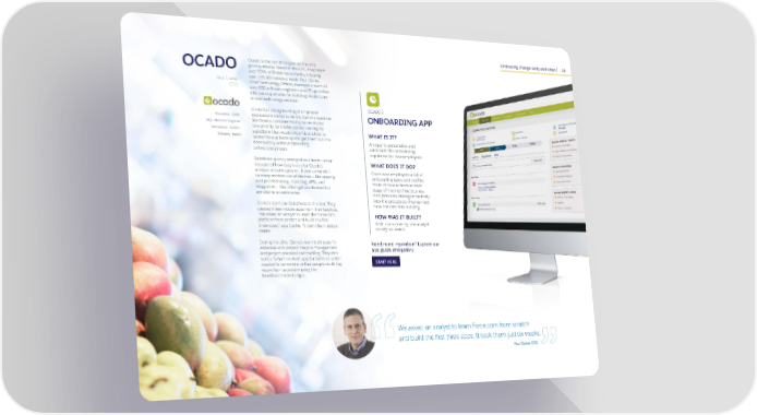 Embracing change early and often 10 Ocado is the world’s largest online-only OCADO grocery retailer. Based in the U.K., they reach over 70% of British households, shipping Paul Clarke over 165,000 orders a week. Paul Clarke, CTO Chief Technology Officer, manages a team of over 650 software engineers and IT specialists who are responsible for building Ocado’s end- to-end technology solution. Clarke has a long backlog of employee OCADO’S Founded: 2000 applications on his to-do list, but in a business ONBOARDING APP HQ: Hatfield, England like Ocado, customer-facing issues always Workforce: 9,000+ take priority. So Clarke started looking for a platform that would allow his analysts to WHAT IS IT? Industry: Retail tackle the app backlog and get them out the door quickly without distracting An app to personalize and software engineers. automate the onboarding exprience for new employees. Salesforce quickly emerged as a front-runner WHAT DOES IT DO? because of how easy it was for Ocado’s analysts to build apps on. It also came with Gives new employees a list of so many services out-of-the-box — like security onboarding tasks and notifies and permissioning, reporting, APIs, and them of new actions at each integration — that often get overlooked but stage of the new hire journey. are vital to an enterprise. Also provides managers visibility Clarke’s team put Salesforce to the test. They into the process so they can see created three mobile apps from their backlog. how the new hire is doing. “We asked an analyst to learn the Force.com platform from scratch and build the first HOW WAS IT BUILT? three apps,” says Clarke. “It took them just six With Force.com by one analyst weeks.” in only six weeks. During the pilot, Clarke’s team built apps for Need more inspiration? Explore our expenses and project lifecycle management app guide and gallery. and project proposal and tracking. They also NEED MORE INSPIRATION? built a “what’s broken” app for facilities, which START HERE SEE OUR APP GUIDE needed to be mobile so that people could log AND GALLERY. issues from anywhere using the Salesforce1 Mobile App. We asked an analyst to learn Force.com from scratch and build the first three apps. It took them just six weeks. Paul Clarke, CTO